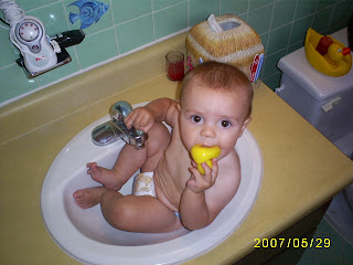 Landon loves taking a bath, and now that he can stand up there is no stopping this kid. He grabs onto the edge and pulls himself up, we have to clear off the ledge of all the shampoos and soaps so that he will not get them because thats the first thing he goes for, no matter how many toys we give him he still wants the "big kid" stuff. He is a little pistol. He still loves to suck on his wash rag to get his water for the day. Once he has "drank" all the water out of the wash rag he will stick it back in the water and "refill" it then drink some more. Too smart for his own good.